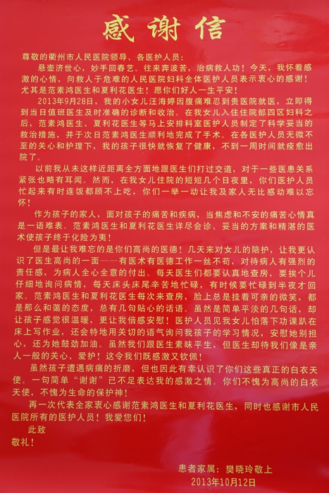??? 10月15日上午,醫(yī)院院辦收到一位患者家屬送來(lái)的感謝信和錦旗,表達(dá)了對(duì)我院婦科醫(yī)護(hù)人員在她女兒住院期間給予精心治療、護(hù)理的感激和贊揚(yáng)之情。