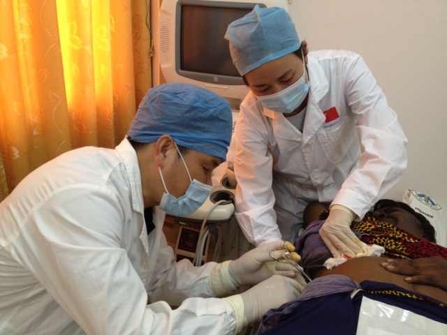 我院超聲科陳曉華醫(yī)生與隊友一起為患者做超聲介入治療