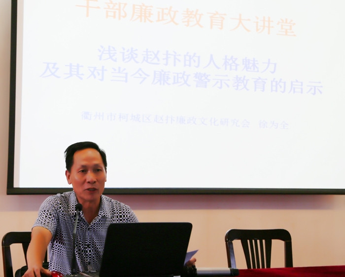 ??? 徐為全老師通過講述“鐵面御史”趙抃的事跡,充分剖析他的人格魅力,詳細(xì)介紹了趙抃廉政文化的歷史價(jià)值和現(xiàn)實(shí)廉政警示教育意義。