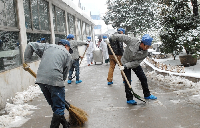 ??? 因天氣原因,地上積雪很厚,給患者就醫(yī)和職工出行帶來諸多不便。1月4日下午,我院總務(wù)處、保衛(wèi)處、維修中心組等部門的職工不畏嚴(yán)寒,自發(fā)清掃地上的積雪,為大家?guī)肀憷?/DIV>