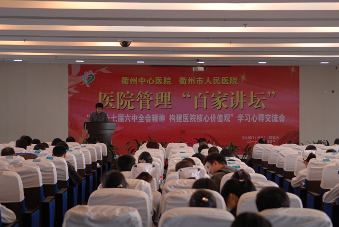 11月4日下午,我院在學(xué)術(shù)報告廳舉行醫(yī)院百家講壇。本期百家講壇的主題是“學(xué)習(xí)十七屆六中全會精神,構(gòu)建醫(yī)院核心價值觀”學(xué)習(xí)心得交流。來自醫(yī)院行政支部、后勤支部、門診支部、外科支部、內(nèi)科支部推薦的10名選手在講壇上暢談了學(xué)習(xí)醫(yī)院核心價值觀的心得體會。徐周佳院長、徐天才書記等院領(lǐng)導(dǎo)參加了本次講壇,徐周佳院長還就“以社會期望為導(dǎo)向,以病人滿意為標準,以集體榮辱為己任,以全員進步為共識”的醫(yī)院核心價值觀闡述了自己的觀點,現(xiàn)摘錄如下: