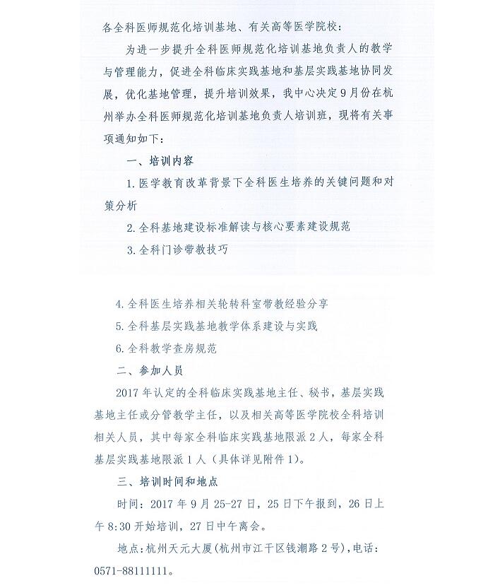 轉(zhuǎn)發(fā)《關(guān)于舉辦浙江省全科醫(yī)師規(guī)范化培訓(xùn)基地負(fù)責(zé)人培訓(xùn)班的通知》 文章來(lái)源:科教處 作者: 點(diǎn)擊數(shù):7846 更新時(shí)間:2017-09-15 點(diǎn)擊:關(guān)于舉辦浙江省全科醫(yī)師規(guī)范化培訓(xùn)基地負(fù)責(zé)人培訓(xùn)班的通知 章幽芳 2017-09-15 上一篇: 轉(zhuǎn)發(fā)《關(guān)于舉辦第一期住院醫(yī)師規(guī)范化培訓(xùn)》的通知 下一篇: 轉(zhuǎn)發(fā)《2018年國(guó)家開展住培年度業(yè)務(wù)水平測(cè)試我省測(cè)試成績(jī)排名》