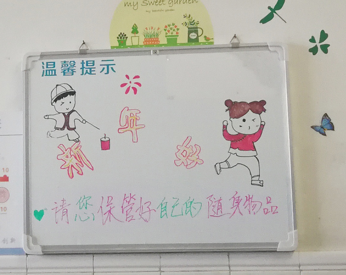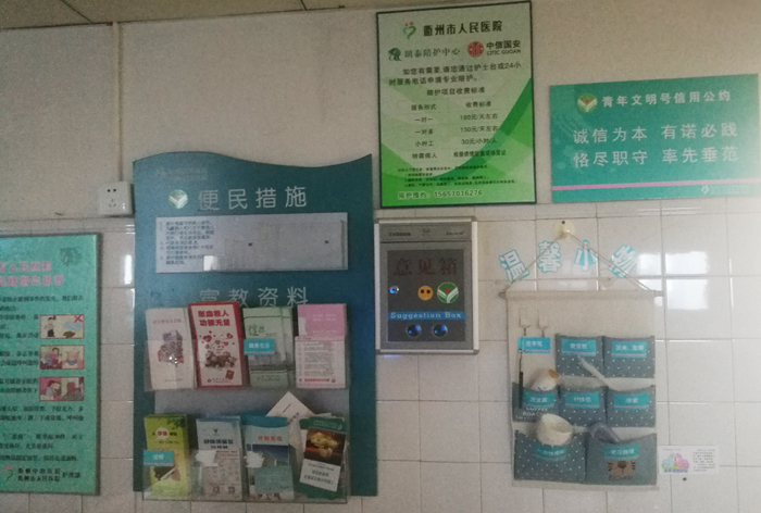 在門廳、走廊、過道、病房、梳妝鏡等張貼結(jié)合主題的美化墻面的裝飾物,病房懸掛由護(hù)士自行繪制的溫馨提示板,來營(yíng)造美化溫馨溫暖的環(huán)境氛圍。