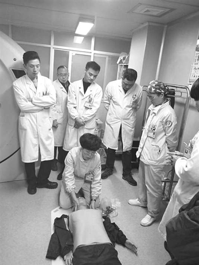 近日,衢州人民醫(yī)院放射科開展了一次“做CT檢查患者突發(fā)呼吸心跳驟停搶救應(yīng)急演練”。以提高醫(yī)護(hù)人員的應(yīng)變搶救能力,檢查醫(yī)務(wù)人員對(duì)搶救流程、搶救設(shè)備使用、心肺復(fù)蘇及除顫技能的掌握熟練程度。