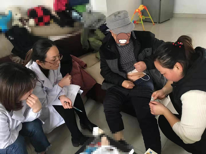 腹透醫(yī)生喻敏、腹透護(hù)士毛玲玲、張何虹給病友做檢查,從血壓、尿量、體重的日常監(jiān)測,及環(huán)境、飲食、用藥等方面進(jìn)行指導(dǎo)。