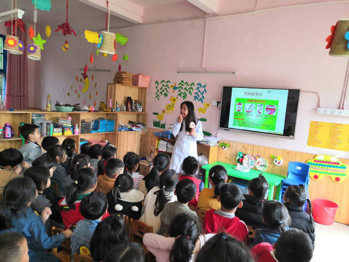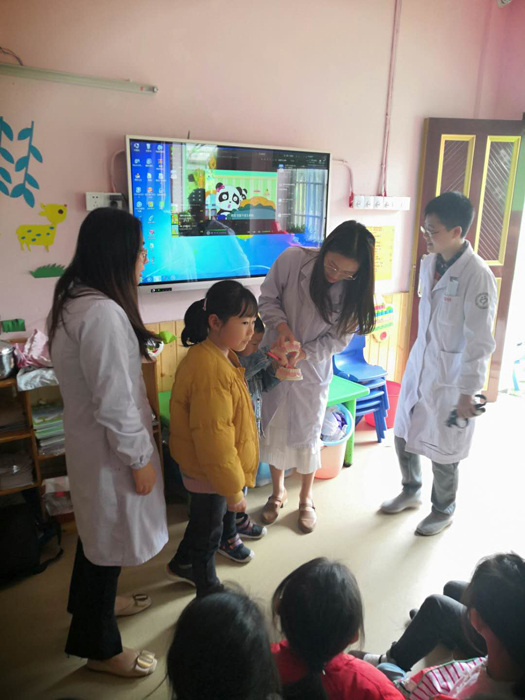 醫(yī)護(hù)人員現(xiàn)場用蛋殼與食醋發(fā)生反應(yīng)的實驗生動形象地告訴小朋友們不良飲食習(xí)慣給牙齒帶來的危害,并教會小朋友正確的刷牙方法。