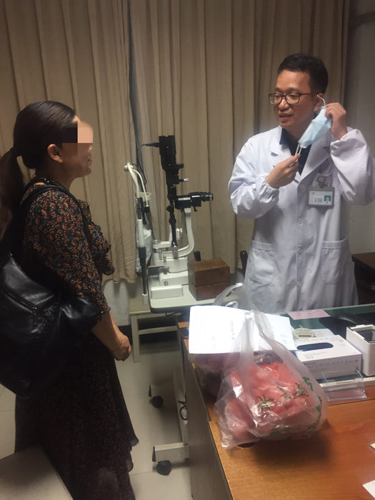 說到感謝信背后的故事,還要追溯到去年5月份。當(dāng)天,涂女士車間做工時(shí),不小心被機(jī)器切割時(shí)飛起的碎鐵片刺穿左眼,什么也看不見了?!爱?dāng)時(shí)就懵了,只覺得眼睛非常痛,不停流眼淚,睜不開。”涂女士回憶說,她先后去了兩家醫(yī)院,都覺得傷勢(shì)過重,要求她去上級(jí)醫(yī)院治療。經(jīng)多方轉(zhuǎn)輾后,涂女士來到了衢州市人民醫(yī)院眼科就診?!盎颊弋?dāng)時(shí)的情況很不樂觀。” 童毓華介紹說,“碎鐵片射穿角膜 、虹膜進(jìn)入眼內(nèi),插在晶狀體上,透明的晶體已經(jīng)局部混濁,我們當(dāng)時(shí)就行了急診眼內(nèi)異物取出術(shù)和角膜修補(bǔ)手術(shù),雖然手術(shù)難度比較大,但及時(shí)治療后患者破損囊膜愈合較好,白內(nèi)障也沒有再進(jìn)展,保住了晶狀體和視力。能幫助患者重見光明,作為醫(yī)生的我,還是很開心的!”