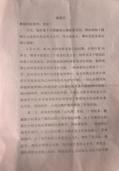 據(jù)悉,5月6日,陳先生的母親——86歲的童奶奶因?yàn)樾膭?dòng)過(guò)緩被緊急送到我院急診科,原本在家休息的心血管內(nèi)科主任醫(yī)生金奇志接到通知后緊急趕來(lái)醫(yī)院,在了解患者情況后立刻展開救治工作。經(jīng)過(guò)一系列常規(guī)檢查后,為童奶奶進(jìn)行了安裝心臟起搏器手術(shù),術(shù)后經(jīng)過(guò)精心治療護(hù)理,恢復(fù)良好,目前已經(jīng)痊愈出院。
