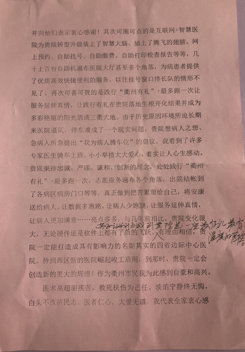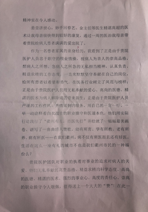 “我母親帶著貴院給患者滿滿的愛(ài)出院了。感謝你們用無(wú)私奉獻(xiàn)的愛(ài)心、高尚的醫(yī)德、精湛的醫(yī)術(shù)為病人解除痛苦帶來(lái)新生,用實(shí)際行動(dòng)繪就了‘衢州有禮,市醫(yī)先行’的最美畫卷,譜寫了一曲曲感人贊歌,作為一座最有禮城市的衢州市民我感到十分幸福!”