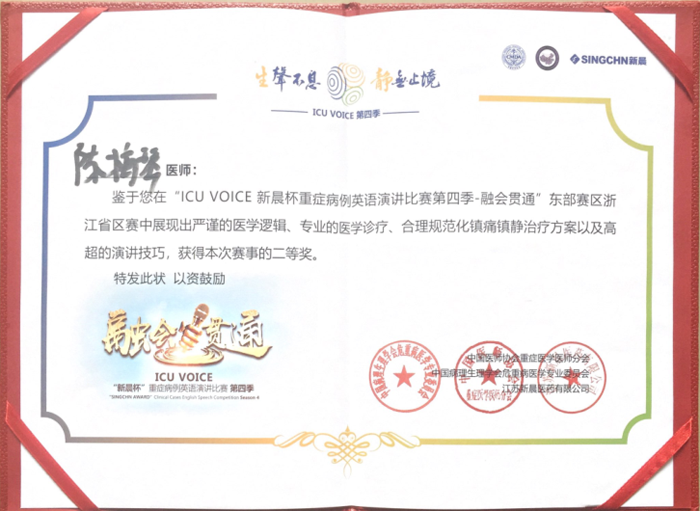 喜報(bào)!重癥醫(yī)學(xué)科陳梅琴榮獲“ICU VOICE 新晨杯重癥病例英語(yǔ)演講比賽第四季”浙江賽區(qū)晉級(jí)賽二等獎(jiǎng)