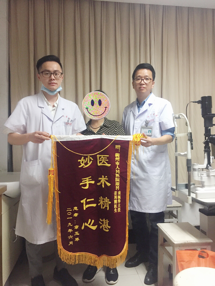 6月19日上午,市民章阿姨來到我院眼科門診,將一面印有“ 醫(yī)術(shù)精湛 妙手仁心”的錦旗送到童毓華主任醫(yī)師和他的學(xué)生姜利剛醫(yī)生的手里,并感激地說:“真的特別感謝你們,多虧了你們的幫助,才讓我及時地來院治療,并順利地用上了藥!”