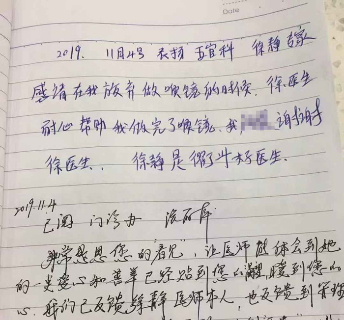 11月4日,盧女士來(lái)到耳鼻咽喉科復(fù)診后,在門診意見(jiàn)本上寫下了一行醒目的感謝......