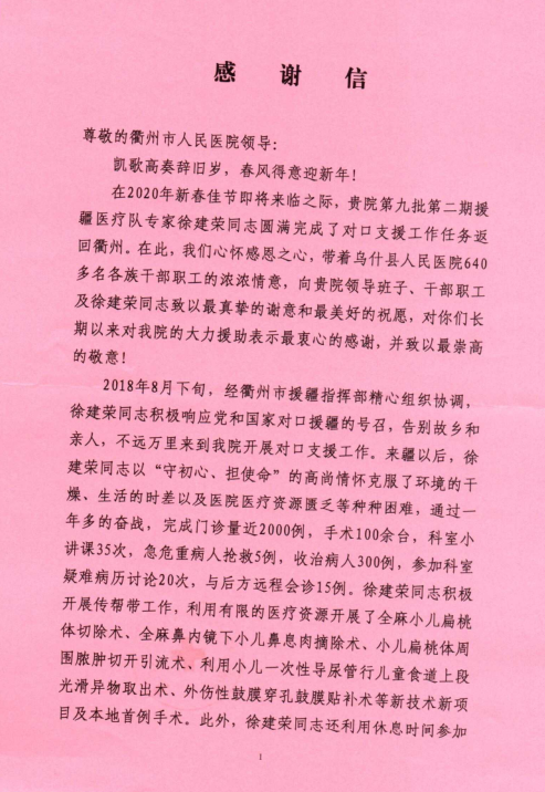這封感謝信來自千里之外的新疆烏什縣人民醫(yī)院,醫(yī)院640名各族干部職工帶著濃濃的情意,感謝我院多年來給予的關(guān)心支持和無私幫助,感謝醫(yī)療隊(duì)專家徐建榮對(duì)烏什縣人民醫(yī)院給予的醫(yī)療幫扶。