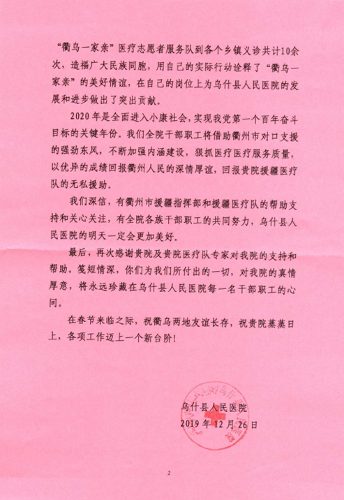 箋短情深,感謝信中,烏什縣人民醫(yī)院表示,各族干部職工將帶著這份感恩建設(shè)好醫(yī)院,不斷加強(qiáng)內(nèi)涵建設(shè)及醫(yī)療質(zhì)量管理,以優(yōu)異的成績(jī)回報(bào)衢州人民的深情厚誼,回報(bào)貴院援疆醫(yī)療隊(duì)的無私援助,迎接醫(yī)院更美好的明天。