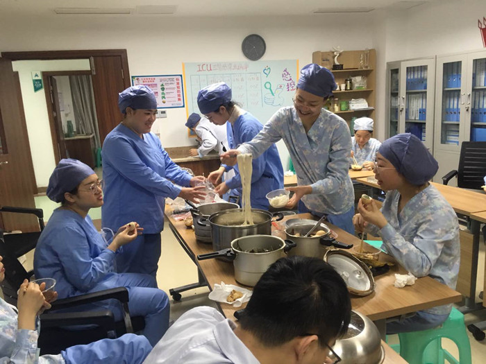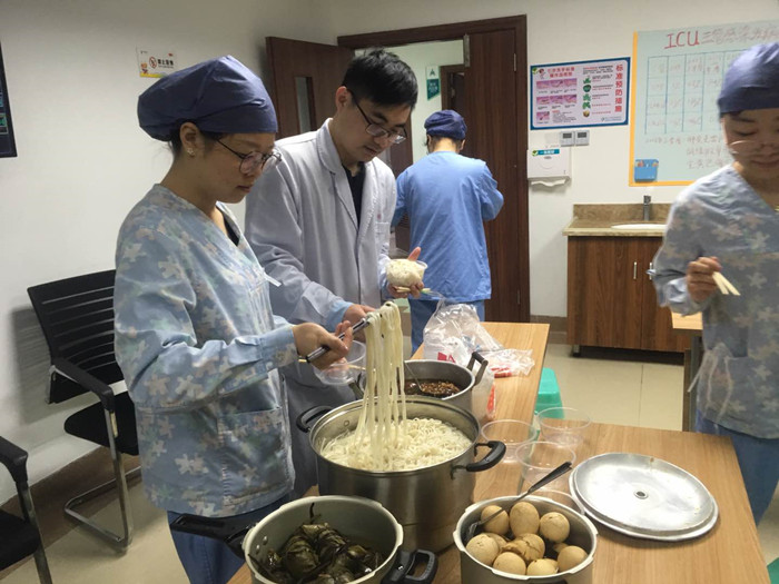“大家忙空了就趕緊過(guò)來(lái)吃長(zhǎng)壽面咯!還有茶葉蛋、粽子!”大年初一,84歲的吳爺爺和76歲的羅奶奶兩人手里拎著沉甸甸的早飯,來(lái)到了我院ICU病房招呼正在忙碌的醫(yī)護(hù)人員吃早飯。
