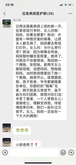 這是我院隔離病房護士陳小麗和孩子對話,入住隔離病房以來,她們的“見面”只能通過視頻連線、微信留言,有一次,孩子想媽媽了,只好隔空傾訴思念,最遠的距離,最暖心的一抱!