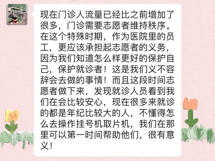 “做志愿者的空隙,我還會(huì)關(guān)注一些其他工作?!彼f(shuō),做志愿者不單單是幫助患者就診,在疫情防控期間,志愿服務(wù)的同時(shí)更要善于發(fā)現(xiàn)就診不流暢的環(huán)節(jié),及時(shí)改進(jìn),才能保障就診規(guī)范有序。