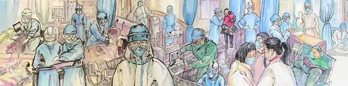 收集素材、勾勒輪廓、描摹上色……短短十天,一幅惟妙惟肖的作品誕生。“我按照紀(jì)念性壁畫的構(gòu)圖方式構(gòu)建我的畫面,雖然它的尺幅沒有壁畫那么大,但是它可以連續(xù)的講述不同場(chǎng)景的故事情節(jié),將所有的情節(jié)連成一曲完整的贊歌?!币粠瑤嬅嬖V說著一個(gè)個(gè)栩栩如生的故事,“病情危急、全力救治、精心護(hù)理、研討病情、關(guān)心關(guān)愛.......”所有的人物、所有的場(chǎng)景均取材于我院抗疫一線的醫(yī)護(hù)人員。