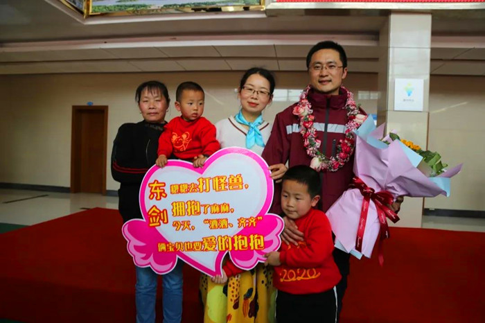 “爸爸打敗病毒怪獸回來(lái)了,爸爸要帶我去兒童公園玩啦!”今天,柴東劍的妻子張金麗帶著“酒酒、奇奇”倆寶貝早早地在現(xiàn)場(chǎng)等候,迎接爸爸回家。張金麗說(shuō):“從出發(fā)那一天開始,全家人都時(shí)刻關(guān)注著新聞,和東劍有關(guān)的消息都會(huì)保存起來(lái)?!泵看斡腥藛?wèn)到兒子,你爸爸去哪里了?他都會(huì)挺著小腦袋,自豪地回答:“我爸爸是奧特曼,他去打怪獸了!”