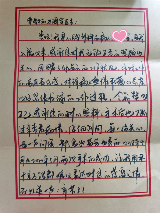 無獨(dú)有偶,患者繆先生在心胸外科手術(shù)期間,萬海軍醫(yī)師精湛的醫(yī)術(shù),熱心的態(tài)度深深感動(dòng)了他??祻?fù)出院后,他為萬海軍醫(yī)師寫下感謝信,將千言萬語的寄托于字里行間,表達(dá)內(nèi)心的謝意。