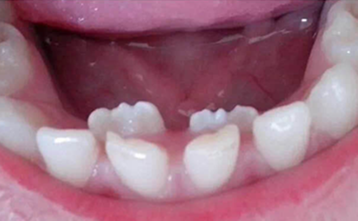 現(xiàn)代飲食過于松軟、精細(xì),家長照顧萌娃時(shí)過于精致,將食物切細(xì),乳牙牙根沒有得到充分的刺激和鍛煉,和牙槽骨緊密相連,不易脫落,“雙排牙”就出現(xiàn)了。如果乳牙病變,發(fā)生齲壞、根尖炎癥等情況,則會造成乳牙根吸收障礙,這也是造成“雙排牙”的常見原因。