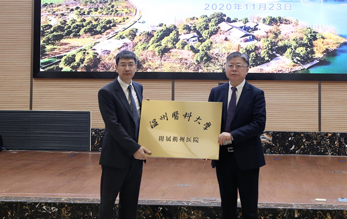 中國工程院院士、溫州醫(yī)科大學(xué)校長李校堃為溫州醫(yī)科大學(xué)附屬衢州醫(yī)院黨委書記陳成水授牌:溫州醫(yī)科大學(xué)附屬衢州醫(yī)院