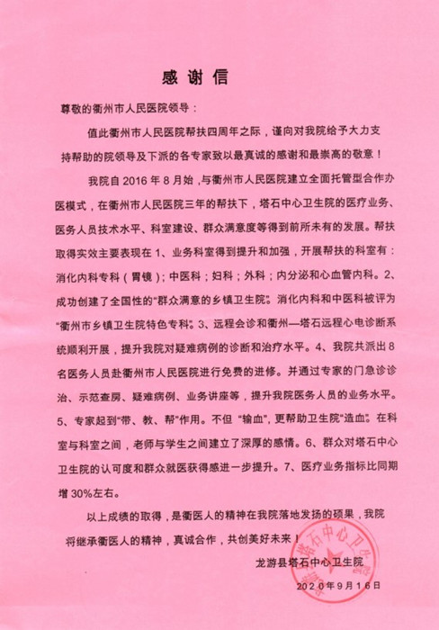 感謝信(致衢州市人民醫(yī)院) 文章來(lái)源: 作者: 點(diǎn)擊數(shù):5593 更新時(shí)間:2020-09-16 上一篇: 感謝信(致衢州市人民醫(yī)院) 下一篇: 感謝信(致張承亮、江菲菲醫(yī)師)