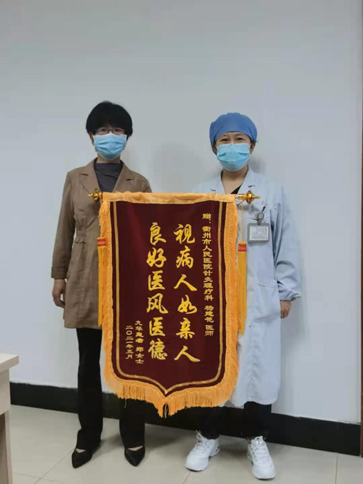 日前,來自柯城九華鄉(xiāng)的鄭阿姨冒雨趕到醫(yī)院,將一面印有“視病人如親人 良好醫(yī)風(fēng)醫(yī)德”的錦旗送到我院針灸理療科副主任中醫(yī)師楊建花手中,對(duì)她優(yōu)質(zhì)的診療、貼心的服務(wù)表示衷心的感謝。