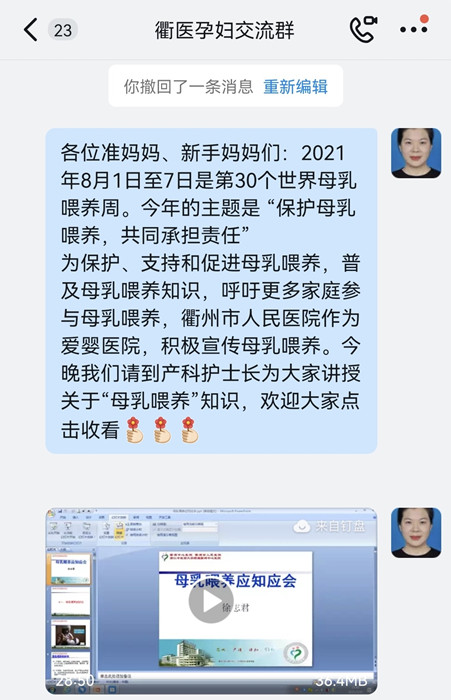 8月4日晚上,產(chǎn)科護(hù)士長徐志君在微信群、釘釘群進(jìn)行“母乳喂養(yǎng)”線上講座,圍繞母乳喂養(yǎng)的好處、母乳喂養(yǎng)的有效方法、促進(jìn)母乳喂養(yǎng)成功的措施、哺乳的姿勢、如何保證產(chǎn)婦有充足的乳汁等相關(guān)知識進(jìn)行全面、詳細(xì)的講解。