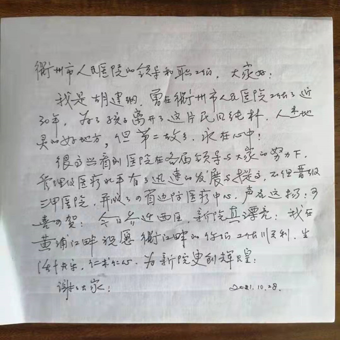 胡建綱曾于1983–1990期間擔(dān)任我院院長,在衢醫(yī)工作了近三十年,把自己的青春與激情都奉獻(xiàn)給了醫(yī)院,也見證了醫(yī)院的成長與發(fā)展。欣聞醫(yī)院搬遷,送上了滿滿的祝福!