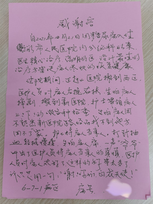 他在信中寫到:“住院期間正趕上醫(yī)院搬到西區(qū),醫(yī)護(hù)人員對病人左攙右扶,生怕病人摔倒;搬到新醫(yī)院,護(hù)士帶病人上上下下做各種檢查,生怕病人因不熟悉新醫(yī)院路線而找不到地方,回不了‘家’?!?