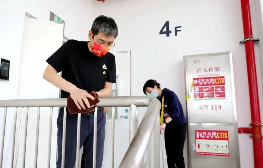 支部樹(shù)旗幟,黨員佩黨徽,讓黨旗飄揚(yáng)起來(lái),讓黨員身份亮起來(lái),把集中攻堅(jiān)氛圍營(yíng)造起來(lái)。在新院各樓道、天臺(tái)以及各種衛(wèi)生死角,不怕臟、不怕累的黨員干部成為了一道風(fēng)景線。