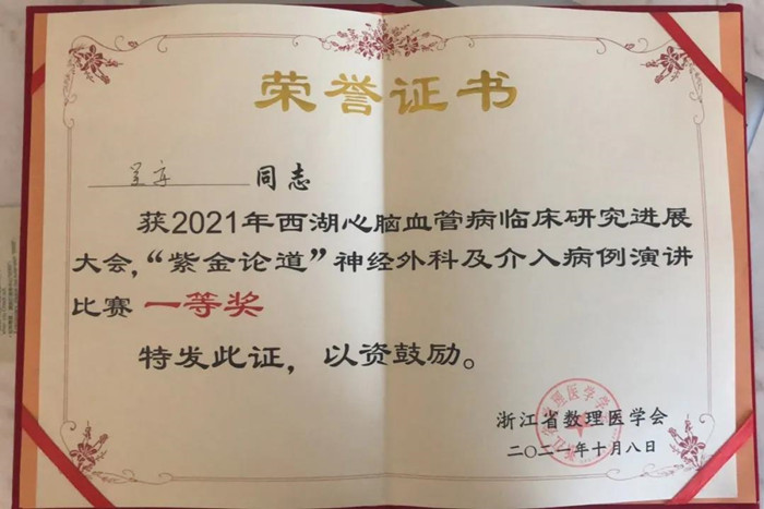 10月8日,2021年西湖心腦血管病臨床研究進(jìn)展大會在杭州召開。我院神經(jīng)外科主任醫(yī)師吳安在浙江省“紫金論道”神經(jīng)外科青年醫(yī)生病例演講比賽中榮獲一等獎。