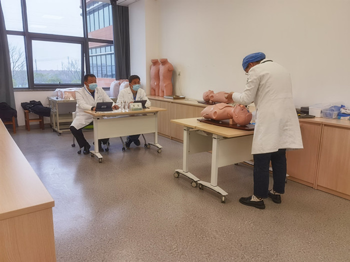 1月14日-16日,實(shí)踐技能考核分別在醫(yī)學(xué)模擬中心和部分專業(yè)基地進(jìn)行。實(shí)踐技能考核采用多站式OSCE模式,應(yīng)用信息管理系統(tǒng)進(jìn)行智能排考、自動(dòng)叫號(hào)。考核包涵病史采集、體格檢查、臨床思維決策、醫(yī)療文書(shū)書(shū)寫(xiě)、心肺復(fù)蘇、氣管插管、??萍寄懿僮鞯龋矫婵己藢W(xué)員的基本技能、臨床思維、人文溝通能力。考官按照詳細(xì)量化考核標(biāo)準(zhǔn)進(jìn)行評(píng)分。
