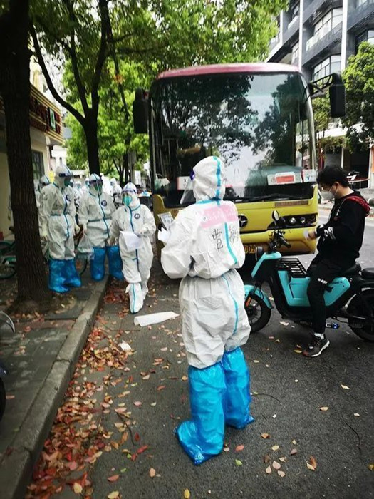 從嘉興駛往上海的近兩個(gè)小時(shí)里,曹老師就沒停歇過:與上海社區(qū)工作人員電話對(duì)接工作,根據(jù)社區(qū)居民人數(shù)進(jìn)行人員分配,與其他車隊(duì)領(lǐng)隊(duì)對(duì)接任務(wù)布置,解答下級(jí)反饋上來的問題,與上級(jí)領(lǐng)導(dǎo)對(duì)接指令……到達(dá)目的地,曹老師又千叮嚀萬囑咐大家要注意防護(hù),規(guī)范操作,遇到問題如何處置。采樣過程中,曹老師又穿著防護(hù)服跑到每個(gè)點(diǎn)位上突擊檢查隊(duì)員們的防護(hù)和操作的規(guī)范性。完成任務(wù)后,大家各自回到大巴前,曹老師已經(jīng)布置好了一區(qū)二區(qū)防護(hù)脫卸的前期工作。兩人一脫,互相監(jiān)督。盡管這樣,大家還是小錯(cuò)誤頻出,或亂了步驟,或一區(qū)二區(qū)不分等。曹老師親自監(jiān)督一百來號(hào)隊(duì)員的院感防護(hù)和脫卸過程,有時(shí)還要回頭看一下脫卸完畢準(zhǔn)備上車時(shí)消殺是否規(guī)范。終于完畢,我發(fā)現(xiàn)曹老師的喉嚨已經(jīng)啞了?;爻痰能嚿?,曹老師打起了盹,但她并沒有沉沉睡去,而是隔幾分鐘睜開眼看下手機(jī),看看是否有新的任務(wù)下達(dá)??偸窃绯鐾須w,長(zhǎng)時(shí)間的控水控大小便等,讓大家疲憊不堪,而當(dāng)我們毫無憂慮地睡去時(shí),曹老師又得為下一次任務(wù)操勞。