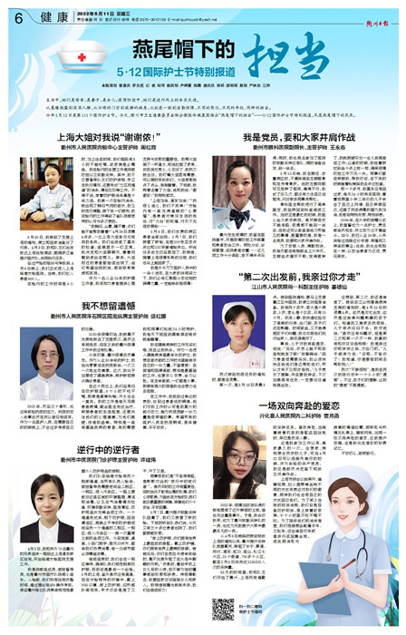今年5月12日是第111個國際護士節(jié)。今天,衢州市衛(wèi)生健康委員會聯(lián)合衢報傳媒集團推出“燕尾帽下的擔當”——5·12國際護士節(jié)特別報道,盡顯燕尾帽下的風采。