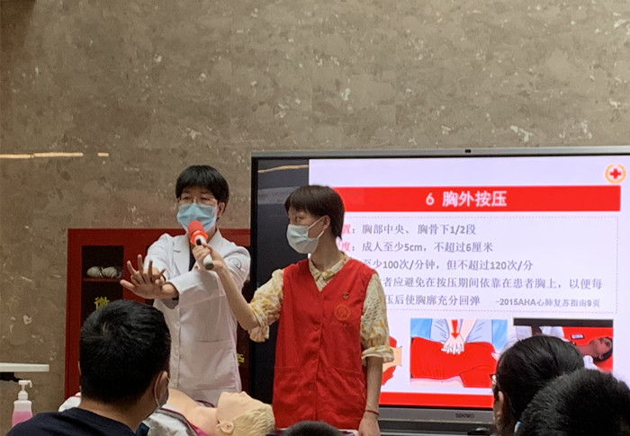 “選擇兩乳頭連線中點為按壓部位,一手掌跟緊貼該部位,十指交叉上翹,雙臂伸直用上身力量垂直向下按壓......”活動現(xiàn)場,我院門診部主任邵微穎向廣大市民現(xiàn)場演示心肺復蘇和自動體外除顫器(AED)的具體操作方法,對動作要領、按壓部位、人工呼吸等技巧進行講解。