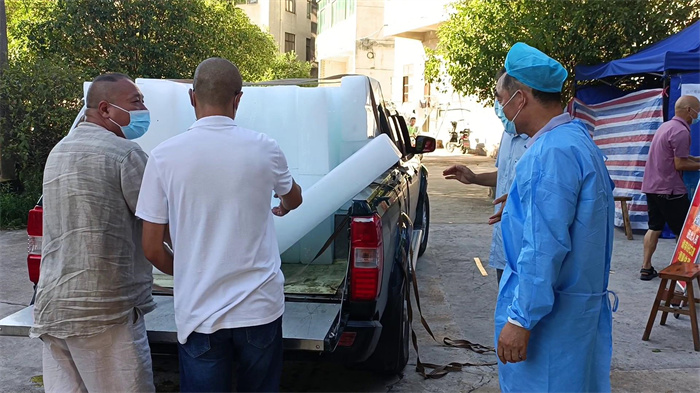 為了給采樣隊員降溫防暑,社區(qū)志愿者馬不停蹄地搬運冰塊
