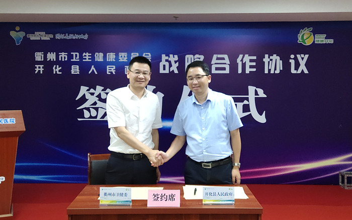 開化縣委常委、常務副縣長樊勇軍和市衛(wèi)健委黨委委員、副主任程科云簽訂開化縣人民政府和衢州市衛(wèi)健委戰(zhàn)略合作協(xié)議