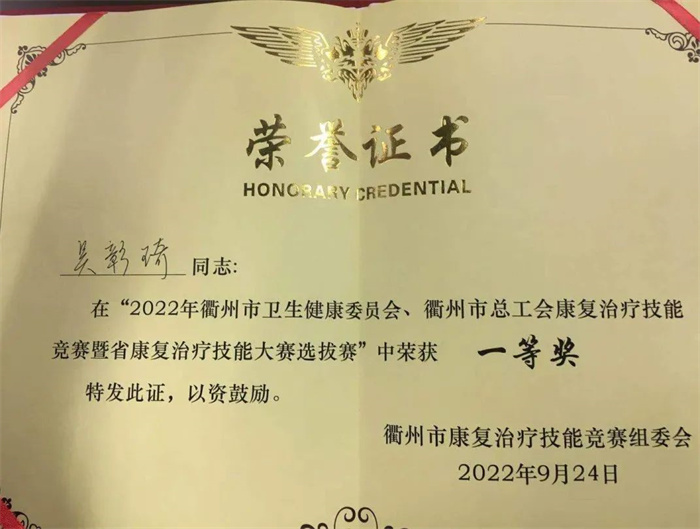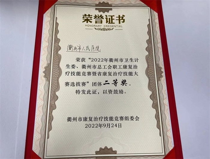 本次競(jìng)賽由來自衢州市16家醫(yī)院的40位選手同臺(tái)競(jìng)技,代表了我市康復(fù)治療技術(shù)的最高水平。經(jīng)過一天的理論測(cè)試和技能操作比拼后,我院康復(fù)醫(yī)學(xué)科吳彰琦榮獲個(gè)人第一名、青年康復(fù)治療師團(tuán)隊(duì)獲得團(tuán)體第二名。