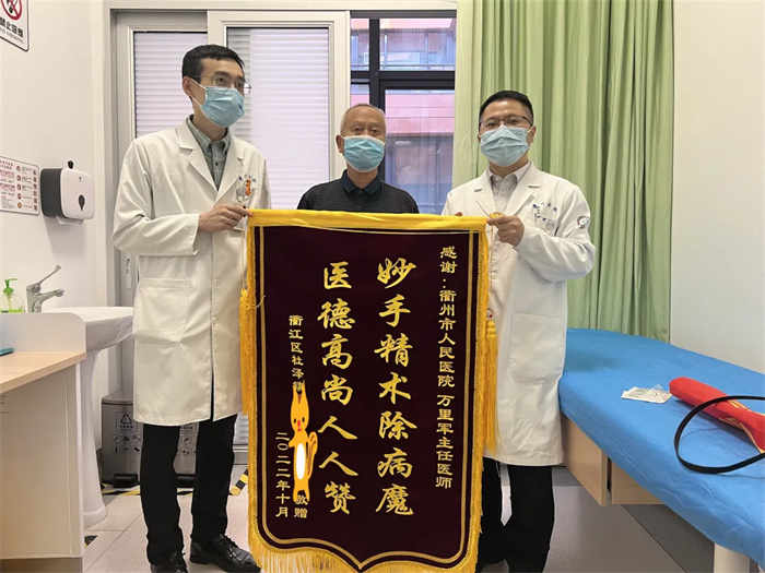 10月4日,張老先生(化名)到衢州市人民醫(yī)院復(fù)查的時(shí)候,特意將一面錦旗,送到泌尿外科主任萬(wàn)里軍手中。