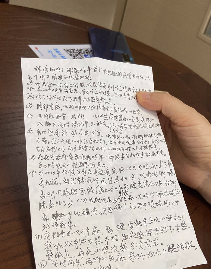 “怕一時說不清,耽誤林醫(yī)生的時間,我就提前將病情寫在紙上。”朱奶奶就診前做足了“功課”,她把自己的病情,和經(jīng)過林醫(yī)生診治后好轉(zhuǎn)的情況一一標(biāo)注。