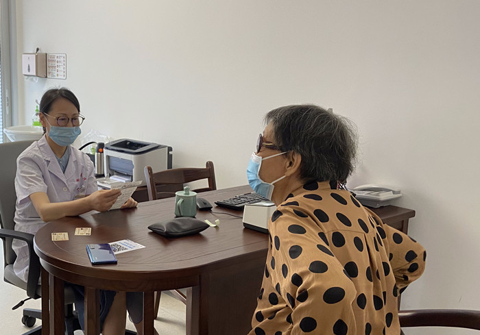在門診5樓名醫(yī)館,80多歲的朱奶奶帶著一張手寫病情的紙條,來到中醫(yī)科專家林元秀門診。