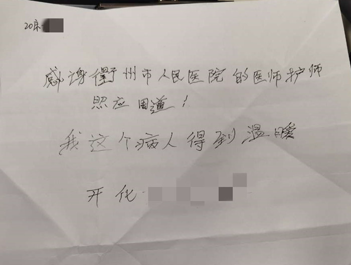 這天,正是全科醫(yī)學(xué)科方奶奶轉(zhuǎn)科的日子,方爺爺向護士借了紙筆,用顫顫巍巍的雙手寫下感激,交給主管護士陳昊琪。
