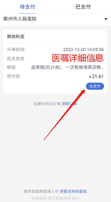 2.點(diǎn)擊【醫(yī)保支付】進(jìn)入醫(yī)囑詳情頁(yè)面
