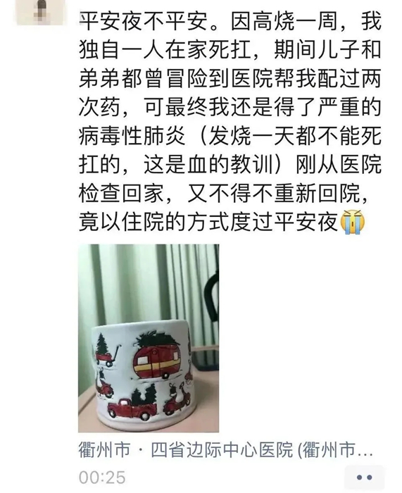 “高燒一周,我獨(dú)自一人在家死扛…..竟以住院的方式度過平安夜?!比涨埃鹿诓《靖腥净颊邉⑴浚ɑ┰谂笥讶锔锌?,今年的平安夜是“燙”著過的。