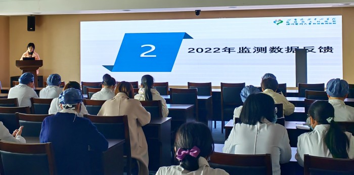院感處副處長沈紅艷通報了我院2022年度院感監(jiān)測情況,并對監(jiān)測結(jié)果進行分析。