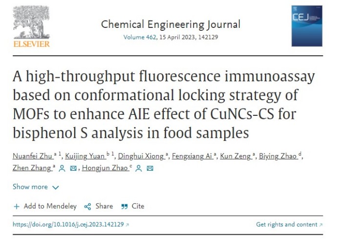 日前,我院藥物臨床試驗機構(gòu)辦公室副主任趙紅軍博士,以通訊作者在國際知名期刊Chemical Engineering Journal上發(fā)表題為《基于MOFs構(gòu)象鎖定策略增強銅納米簇AIE效應構(gòu)建超靈敏雙酚S熒光免疫分析法用于食品中新污染物的污染調(diào)查與人體健康風險評估》的研究論文。