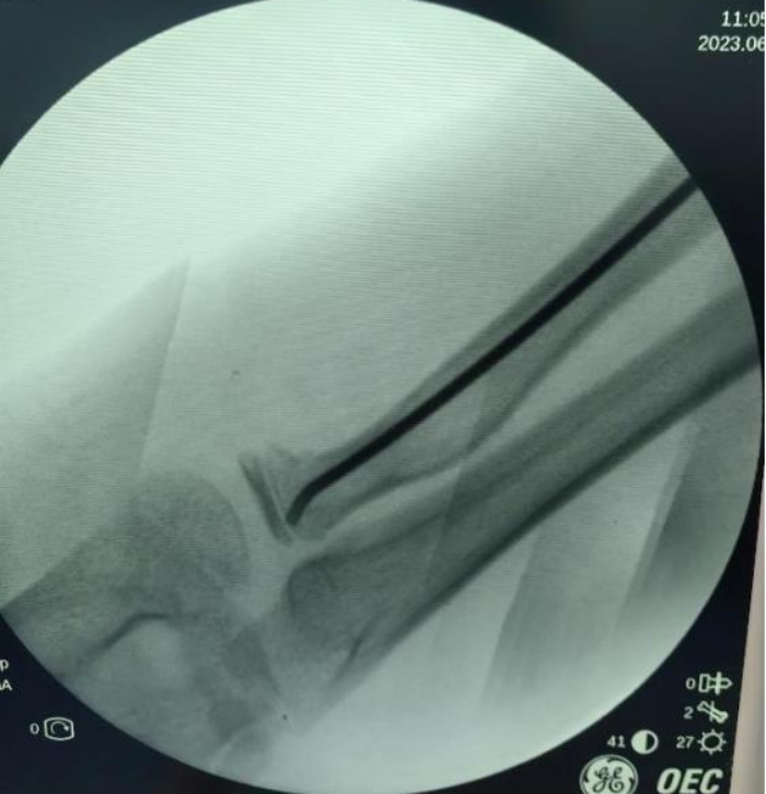 錢鈞組織骨科團(tuán)隊(duì)研討手術(shù)方案,決定為毅毅實(shí)施“橈骨頸骨折閉合復(fù)位彈性髓內(nèi)針內(nèi)固定術(shù)”。