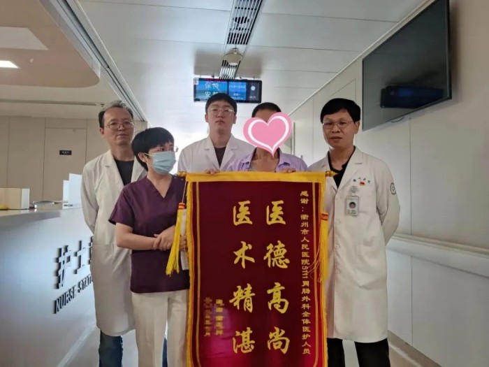 患者停藥休息1個(gè)月后,行胃癌根治術(shù)(全胃切除+roux-y吻合術(shù)),4個(gè)小時(shí)后手術(shù)順利完成。術(shù)后老徐恢復(fù)良好,與家人特地送來錦旗感謝胃外科醫(yī)護(hù)團(tuán)隊(duì)。